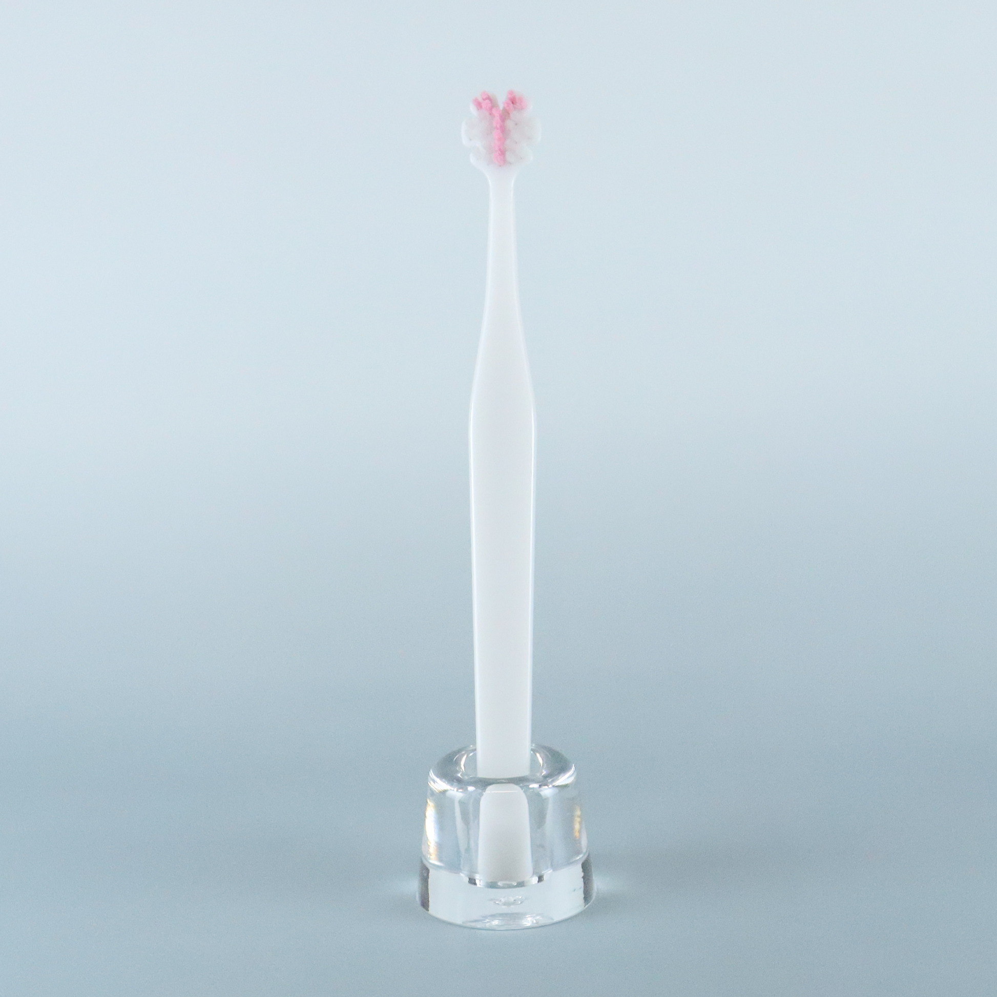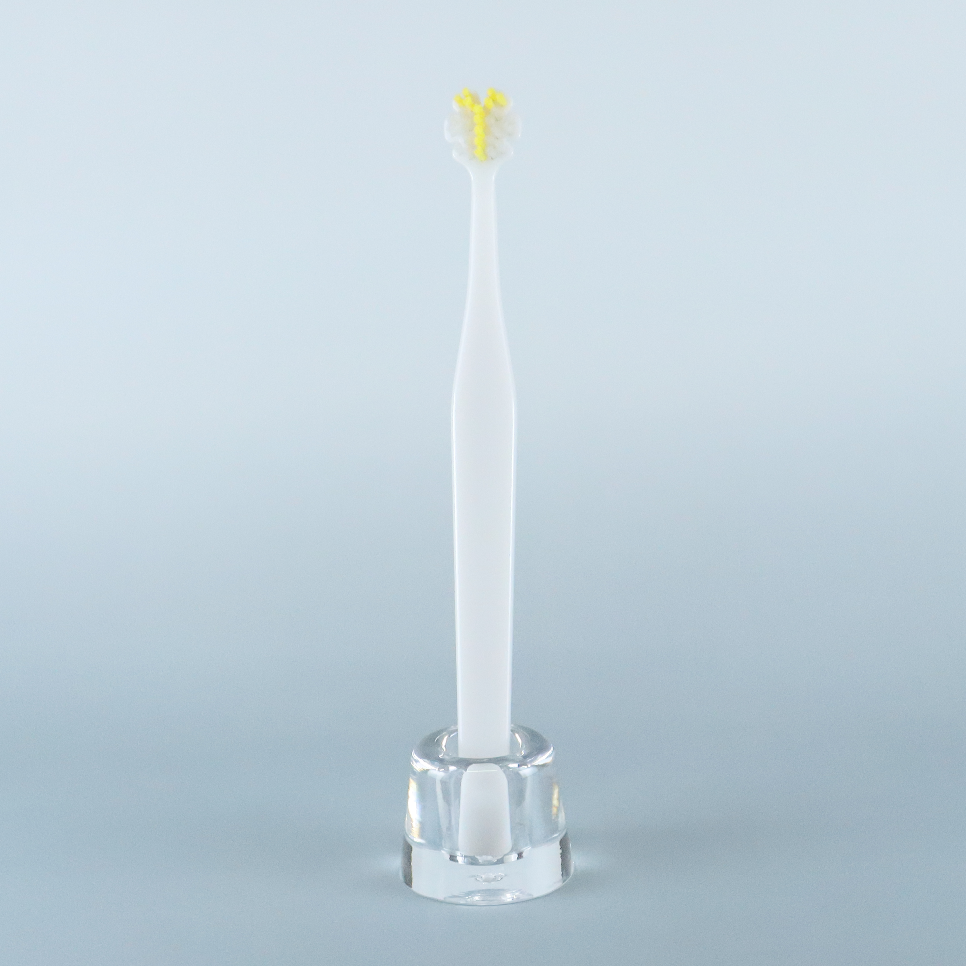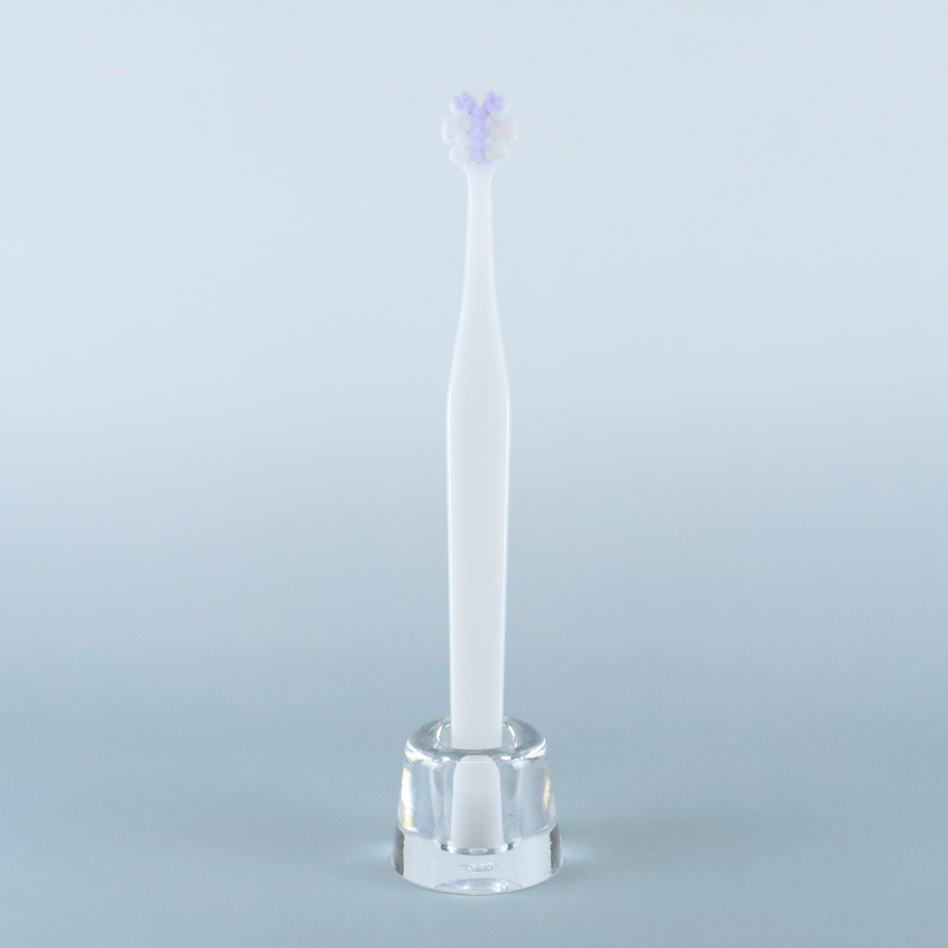 シンプルで機能的な縦磨き歯ブラシ。歯肉をできるだけ傷つけないように考えられたヘッドで、ガイドとなる中心のブラシが、歯と歯の間にしっかりフィット。歯間の汚れを逃さずケアして、大人からお子様まで、軽い動きで簡単に縦磨きができるように工夫しています。