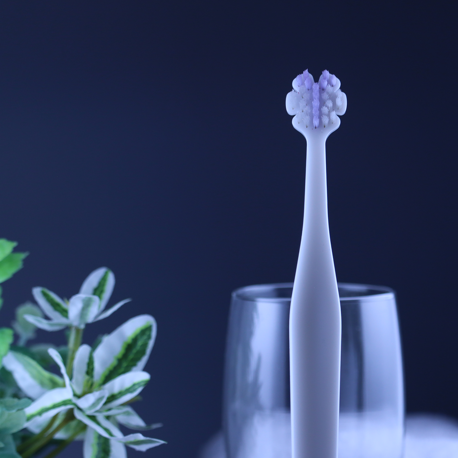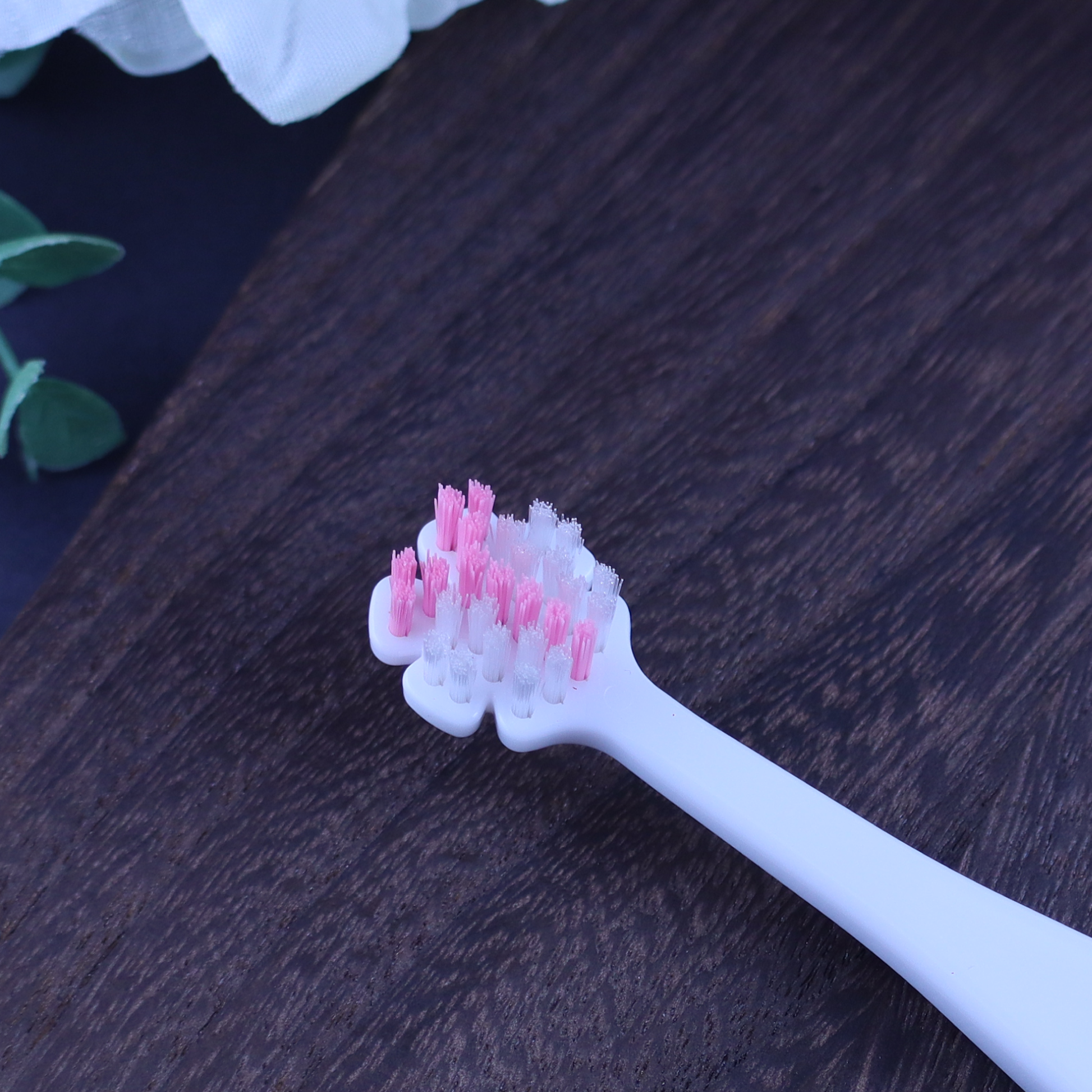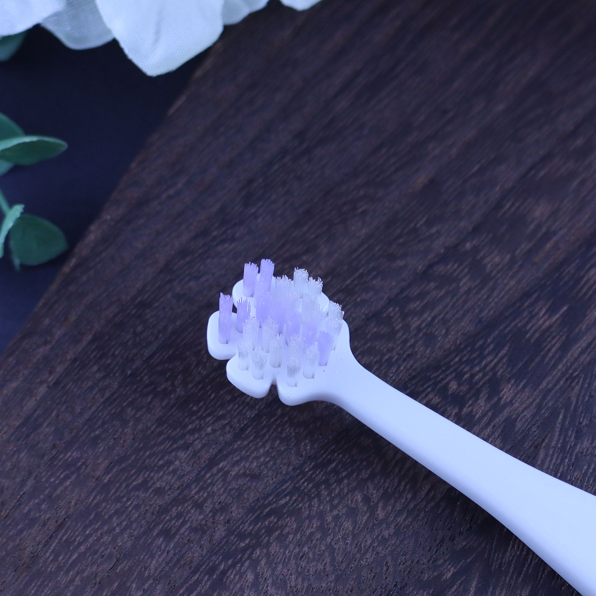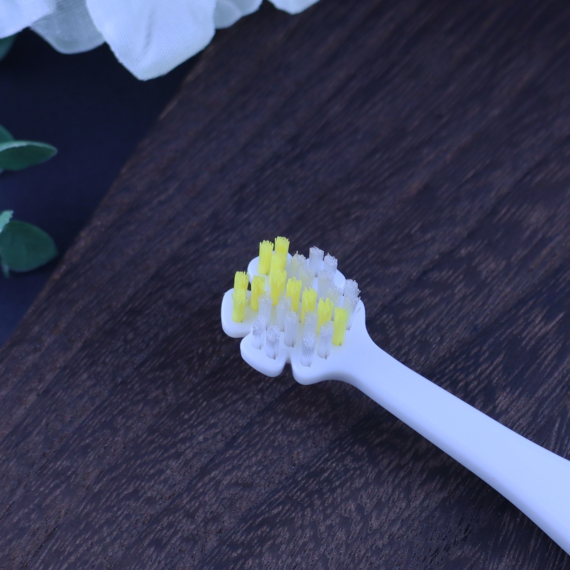 シンプルで機能的な縦磨き歯ブラシ。歯肉をできるだけ傷つけないように考えられたヘッドで、ガイドとなる中心のブラシが、歯と歯の間にしっかりフィット。歯間の汚れを逃さずケアして、大人からお子様まで、軽い動きで簡単に縦磨きができるように工夫しています。